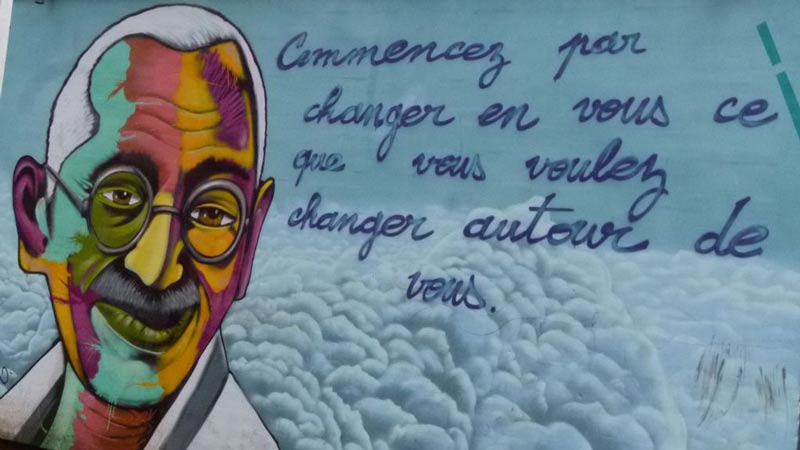 Puis je suis tombé nez à nez avec un graffiti représentant le visage de Gandhi accompagné d'une de ses citations : « Commencez par changer en vous ce que vous voulez changer autour de vous », comprenant que personne n'a la responsabilité de tout faire, mais que chacun doit accomplir quelque chose.