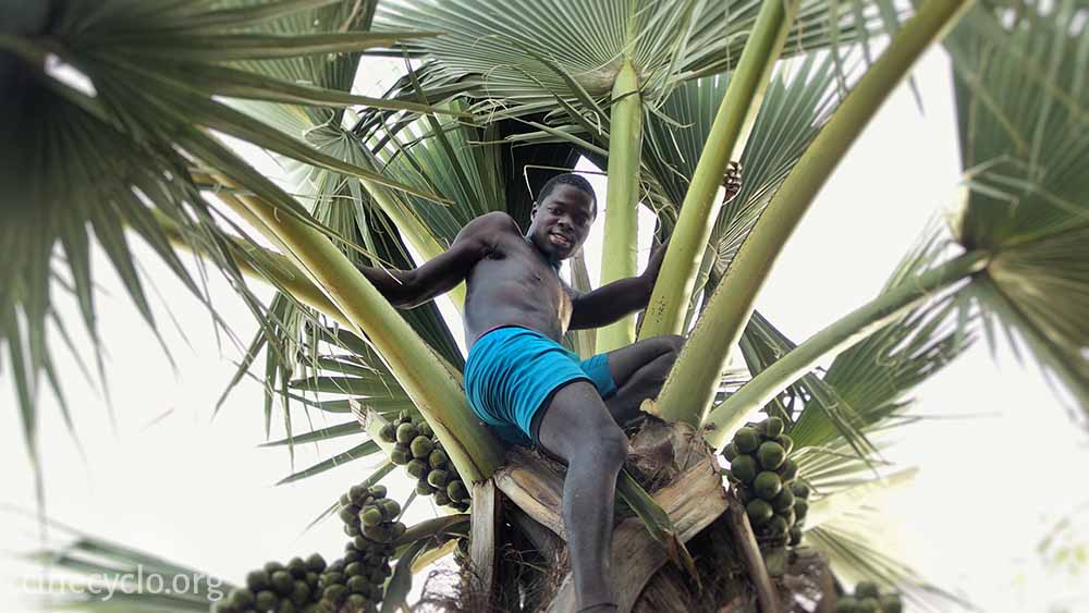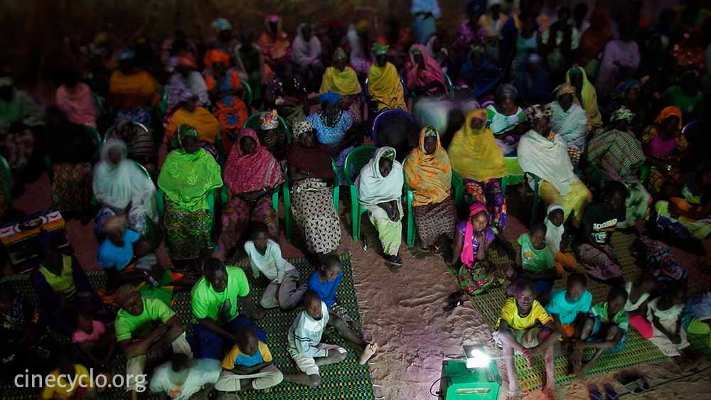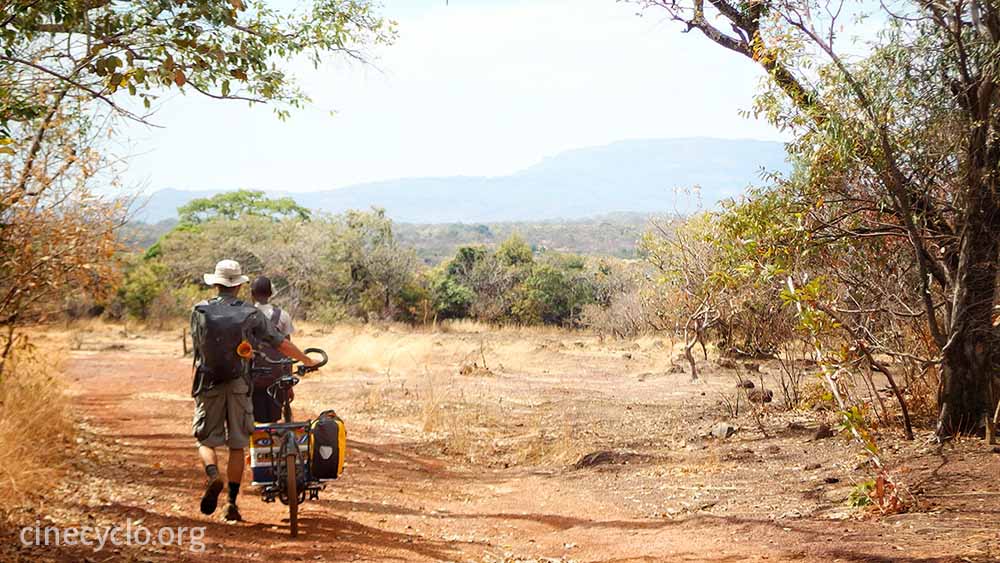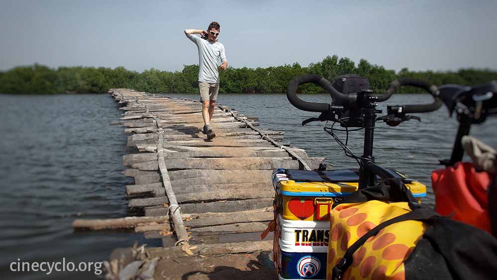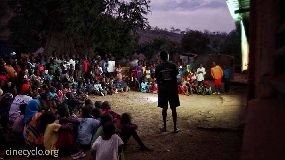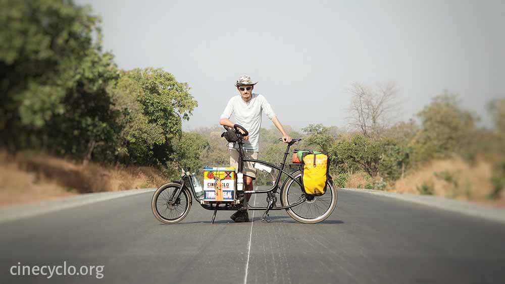 Après la Casamance, nous nous rendons vers notre seconde zone d'intervention qui se trouve à Tambacounda distant de 7 jours de vélos. Il nous est difficile de ne pas offrir de projection lorsque l'on s'arrête dans un village «étape» car tout le matériel est contenu dans une grosse caisse où il est inscrit « Cinécyclo », ce qui pique la curiosité de moindre passant. Le vélo est par ailleurs atypique puisqu'il s'agit d'un vélo cargo fait en France de la marque Douze-Cycles, très solide, maniable et démontable au demeurant. L'ensemble de mon matériel pèse 70 kilos alors que je n'en fais qu'une petite soixantaine.